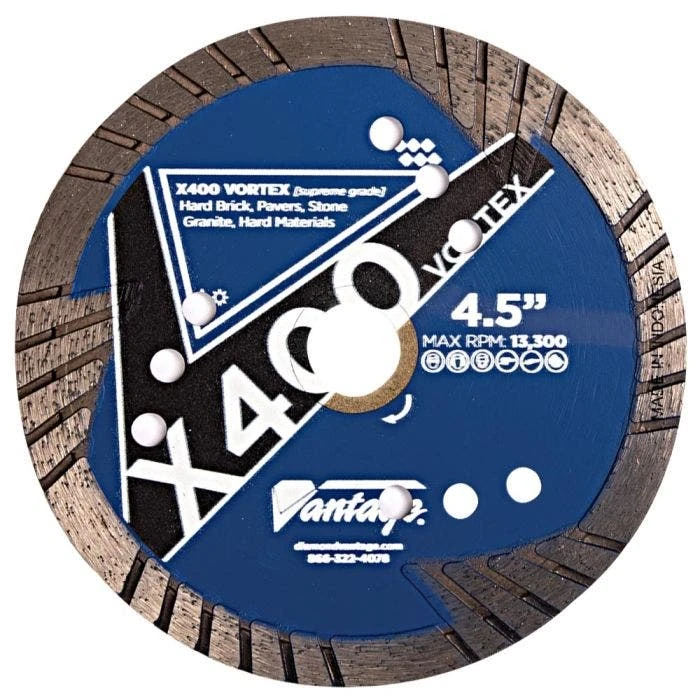 Diamond Vantage designed their X400 Vortex Blade to handle a wide variety of tile and stone materials currently trending in the hardscape industry. These supreme quality diamond blades will cut a wide variety of hard materials. From porcelain and granite tile and natural stones, to standard concrete products like pavers, brick and block. The X400 also makes a good demolition blade and can be used to cut old, hard concrete and reinforced concrete. It features a continuous, 9mm turbo rim height for extended blade life. Its ventilated steel core offers superior cooling. And these blades can be used for both wet and dry cutting applications.