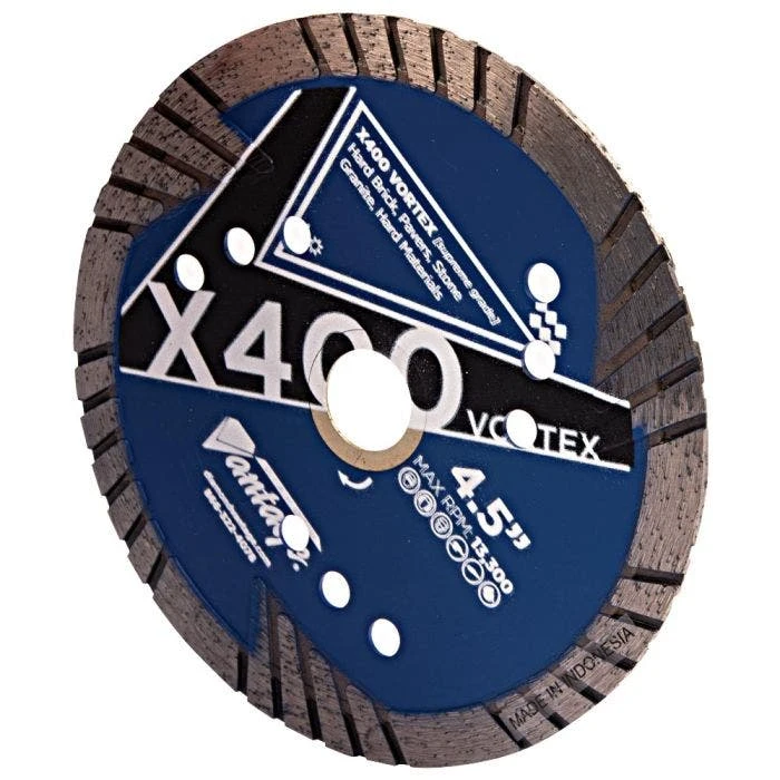 The X400 Vortex Blade has a diameter of 4 1/2″ and is .08″ thick. It also features a 7/8″ to 5/8″ knock out arbor that fits all standard angle grinders.