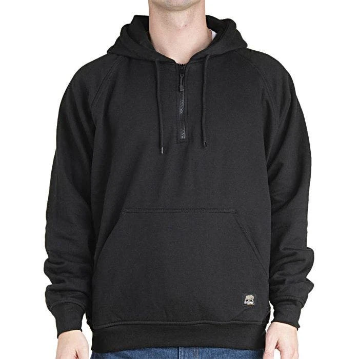 BERNE Mastic Thermal Lined Hooded Quarter Zip is a heavyweight cotton/polyester blended fleece sweatshirt with a double layered, 3 piece hood with a drawstring closure. The inside of the sweater has a 5 ounce thermal lining. It also features a large front pocket and heavyweight rib knit storm cuffs. It is designed for maximum warmth and comfort, and it is available in black and gray colors.