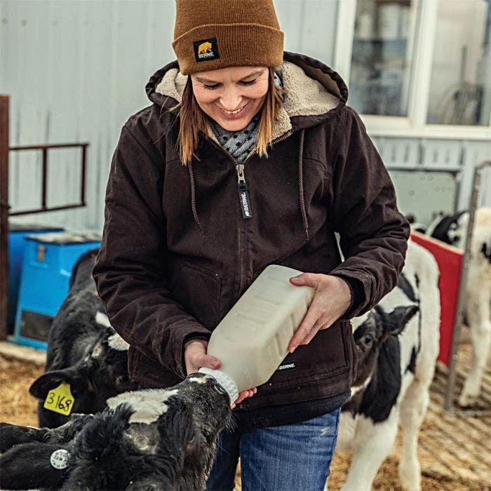 This BERNE Women’s Softstone Hooded Coat features a heavy-duty 10-ounce cotton duck construction with a heavyweight Sherpa-lined interior. The heavyweight taffeta sleeves have pleated elbows and a quilted interior liner for added warmth. In addition, this coat has a three-piece hood with a drawstring closure, hidden knit storm cuffs, and an extended back. This size large tall coat is dark brown in color.