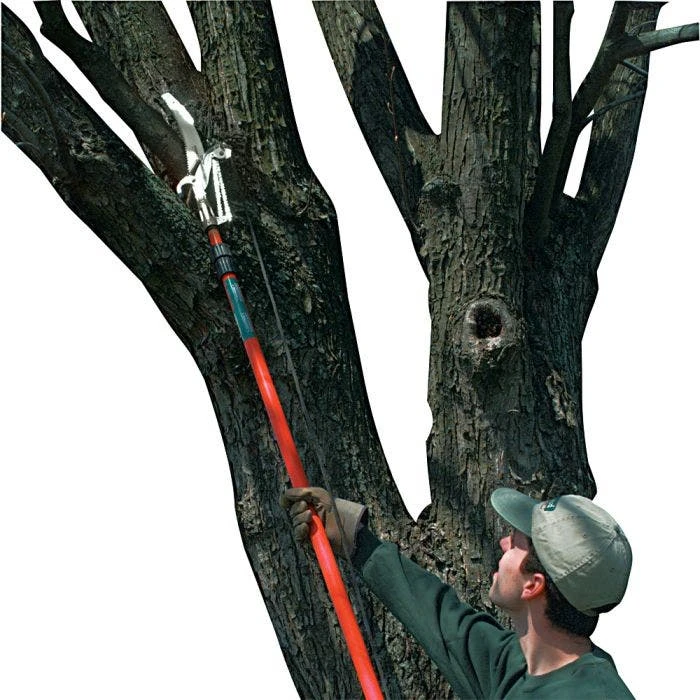 Complete with 17PP high strength, zinc alloy pruning head; 17SB curved, 13″ razor tooth saw blade; fiberglass telescoping pole, with clamp-lock adjustment from 7′ to 14′. 1-1/4″ cutting capacity. Professional results!