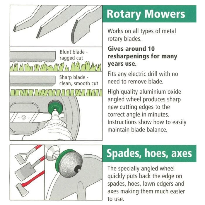 This tool features a tungsten carbide head. This pre-set head gives the correct angle for most types of shears. The third and final tool is the Multi-Sharp Mower Blade Sharpener. This corundum grinding wheel fits any standard power drill. This wheel is reversible, further extending its service life.