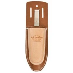 Leonard’s heavy duty leather scabbard for curved saws. Ring on back, snap on front. Protective fiber guard wheel at saw entry.